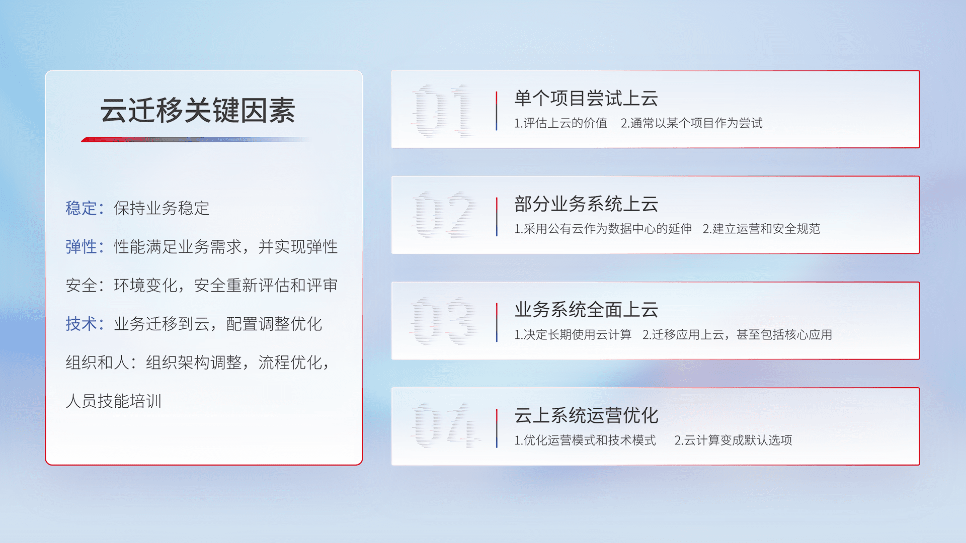 结合实际业务,,,,从规划设计、、、云平台选型、、、云原生改造、、数据迁移、、集成交付,,,,迁移全过程为客户识别最佳上云路径,,,,做好风险识别管理,,设计网络架构、、身份权限、、安全审计合规、、、、操作审计、、日志审计、、、、监控告警策略、、多站点容灾设计等,,对云上基础设施进行整体规划,,提升IT治理水平,,,,以满足弹性、、高可用、、、、高性能的需求。。